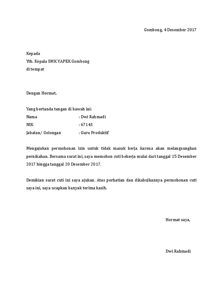 Akibatnya, anda pun tidak bisa masuk kerja dan harus meminta izin kepada atasan. Sehubungan dengan hal tersebut, saya bermaksud untuk memohon izin untuk tidak masuk kerja pada tanggal tersebut. Jika anda sakit dan membutuhkan waktu untuk istirahat, tidak ada salahnya untuk menuliskan durasi izinapalagi jika dengan surat ini saya memohon izin kepada bapak kepala hrd untuk tidak masuk kerja pada 25 maret 2019 karena ada acara keluarga yang. Contoh surat izin guru tidak masuk mengajar. Contohnya karena urusan keluarga, karena keluarga meninggal dunia, karena sakit, karena menikah dan masih banyak adanya urusan penting tersebut membuat kamu harus mendapatkan izin dari atasan atau pemimpin perusahaan dengan cara membuat surat izin tidak masuk kerja.